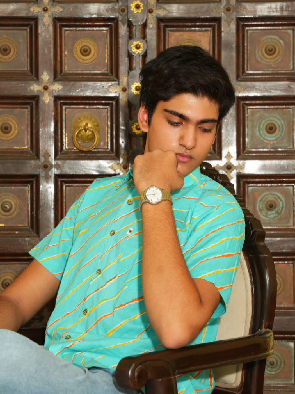 Add a splash of freshness to your wardrobe with the Aqua Breeze Striped Half Sleeve Shirt. Featuring a cool aqua blue base with bold diagonal stripes in yellow, red, and white — this shirt is made for the man who likes to stand out with style.