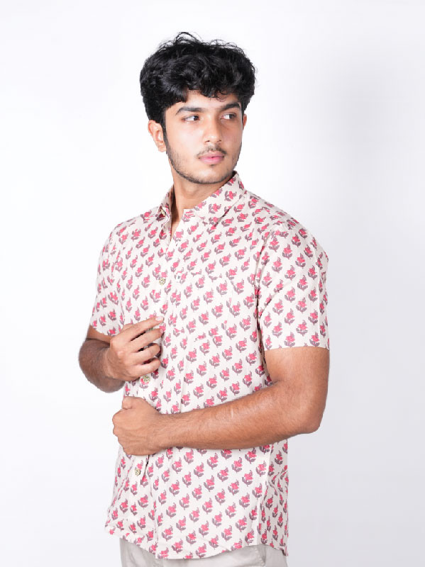 Men's Short Sleeve Floral Printed Shirt, crafted from breathable pure cotton. Featuring a subtle off-white base adorned with hand-block red floral motifs, this shirt brings together comfort and contemporary ethnic style.