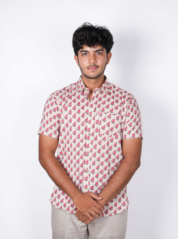 Men's Short Sleeve Floral Printed Shirt, crafted from breathable pure cotton. Featuring a subtle off-white base adorned with hand-block red floral motifs, this shirt brings together comfort and contemporary ethnic style.